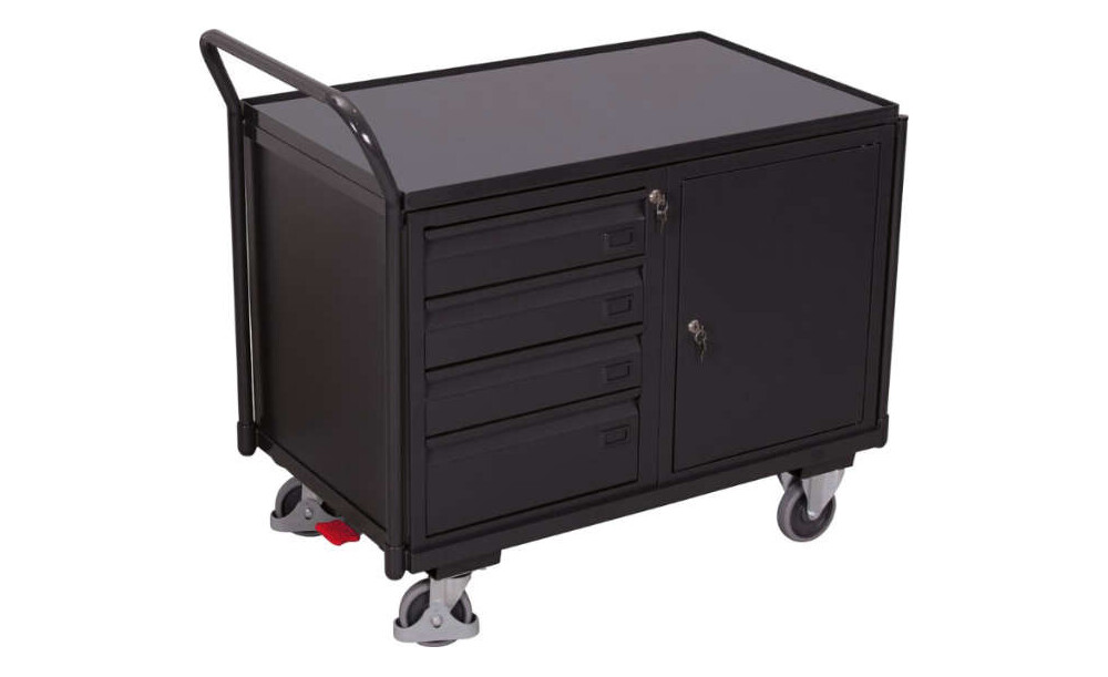 -Tischwagen mit Stahlschrank und Schubladenschrank Diese Tischwagen haben eine Traglast von 250 kg.