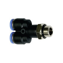 Y-Steckverschraubung »Blaue Serie«, drehbar, G 1/8 a., für Schlauch-Außen-Ø 6 mm, pmax kurzzeitig 15 bar, Kunststoff/MS vern.. Unsere Schnellsteckverbinder-Serie aus Kunststoff bzw. vernickeltem Messing. Die Teile sind einsetzbar in Verbindung mit Kunststoffschläuchen und Kunststoffrohren.