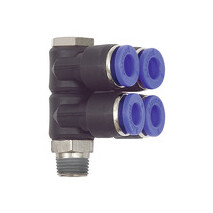 L-Mehrfachverteiler »Blaue Serie«, 4-fach, drehbar, R 1/4 a., für Schl.-Außen-Ø 8 mm, pmax kurzzeitig 15 bar, Kunststoff/MS vern.. Unsere Schnellsteckverbinder-Serie aus Kunststoff bzw. vernickeltem Messing. Die Teile sind einsetzbar in Verbindung mit Kunststoffschläuchen und Kunststoffrohren.