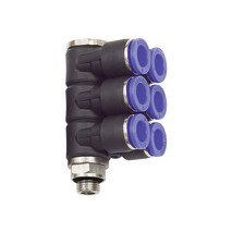 L-Mehrfachverteiler »Blaue Serie«, 6-fach, drehbar, G 1/4 a., für Schl.-Außen-Ø 8 mm, pmax kurzzeitig 15 bar, Kunststoff/MS vern.. Unsere Schnellsteckverbinder-Serie aus Kunststoff bzw. vernickeltem Messing. Die Teile sind einsetzbar in Verbindung mit Kunststoffschläuchen und Kunststoffrohren.