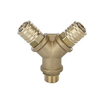 Verteiler mit 2 Schnellverschlusskupplungen NW 7,2, Messing blank, G 1/2 AG, Betriebsdruck 0 - 35 bar, Temp. -20 °C bis 100 °C. 1-, 2- bzw. 3-fach-Verteilerstücke aus Messing blank, fertig konfektioniert mit Schnellverschlusskupplung NW 7,2. Wahlweise mit Anschlussgewinde innen oder außen bzw. Stecknippel zum Adaptieren in eine bestehende Schnellverschlusskupplung NW 7,2 bis NW 7,8.