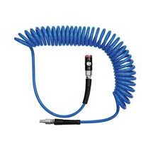 Spiralschlauch-Kupplung-Set, Druckknopf-Sicherheitskupplung NW 7,2, PU, Schlauch-ø 8x5, PN bei 23 °C max. 12 bar, Länge 3,0 m. Der äußerst elastische Polyurethanschlauch verfügt über eine ähnliche Rückholkraft wie der herkömmliche Polyamid-Spiralschlauch, neigt jedoch weniger zur Schleifenbildung und hat eine deutlich höhere Abriebfestigkeit. Die Gefahr des Verkratzens von lackierten oder empfindlichen Oberflächen ist somit geringer. Der Schlauch ist extrem flexibel und knickfest. Nicht geeignet für die direkte Montage an pulsierendem Werkzeug. Wir empfehlen die Verwendung unserer Vibrationsdämpfer, gemäß ISO 6150, § 7.1.
