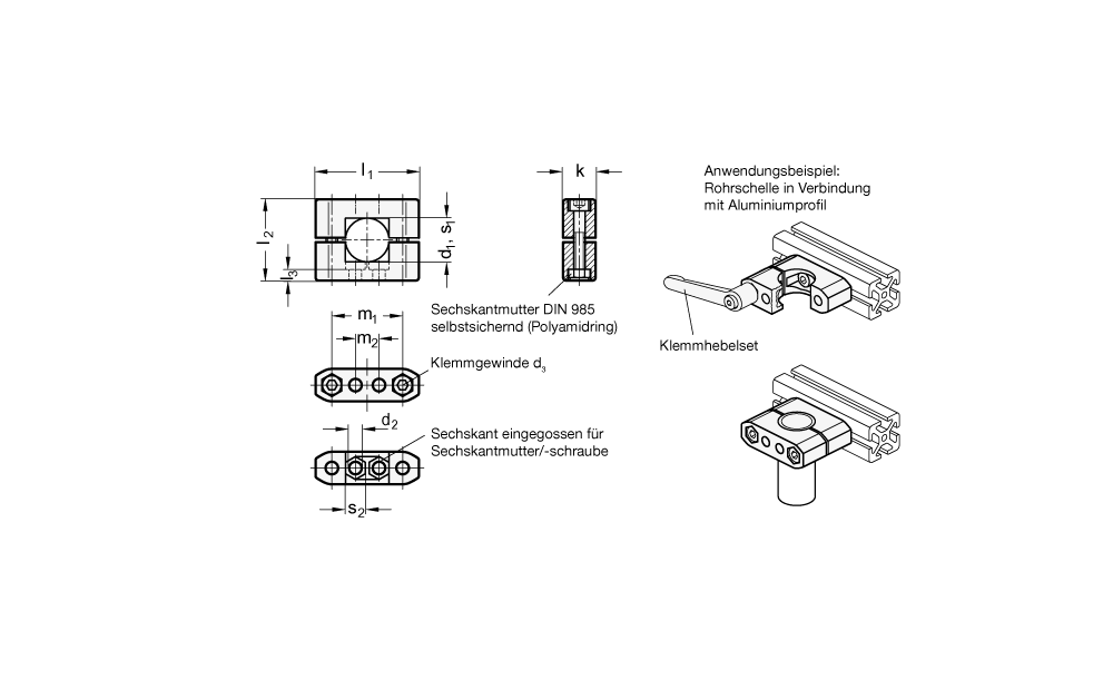 Die Klemmbohrungen der Rohrschellen GN 231 sind unbearbeitet und für Konstruktionsrohre GN 990 bzw. DIN¿2391, DIN 2395 und DIN 2462 ausgelegt.