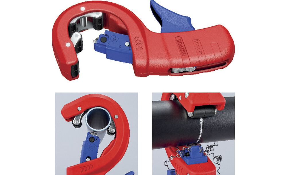 - Ausführungabgefederte Schneidklinge, leichtes Schneiden durch gleitgelagerte und selbsteinstellende Rollen, Nach- oder Feinschnitt ab ca. 10 mm Abschnittlänge möglich, geeignet für HT- und viele andere Kunststoffrohre, glatter Schnitt, kein Nachstellen, kein Entgraten, Wandstärken bis 2,4 mm, Werkzeugkorpus aus glasfaserverstärktem Kunststoff, Wendeklinge mit Doppelschneide zum Wenden bei Verschleiß, werkzeuglos wechselbare Wendeklinge aus hochwertigem Kugellagerstahl