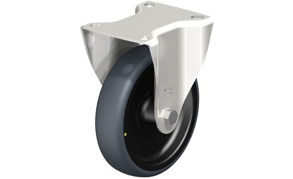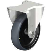 Edelstahl-Bockrolle mit Anschraubplatte, Rad mit thermoplastischem Gummi-Laufbelag, mit Polypropylen-Radkörper, elektrisch leitfähig, spurlos