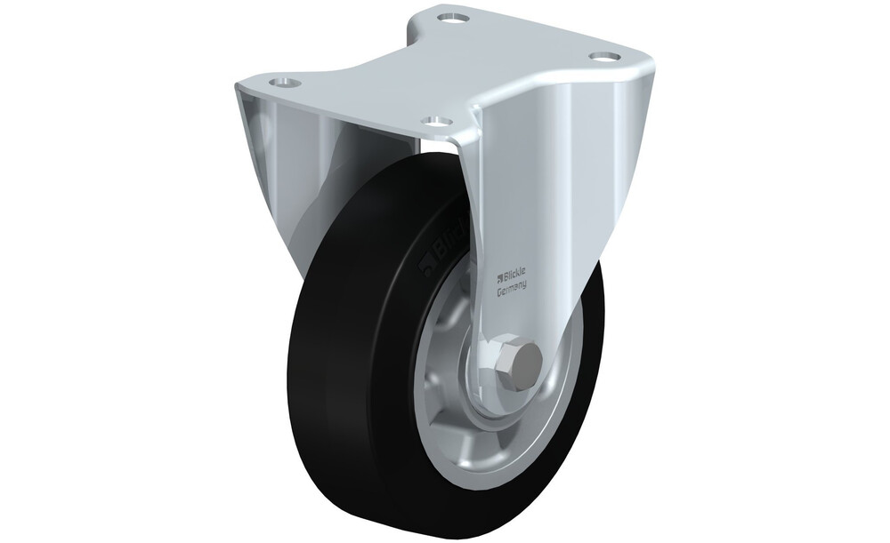 • Reifen: hochwertiger Elastik-Vollgummi "Blickle EasyRoll" in Leichtlaufqualität, Härte 65 Shore A, Farbe schwarz