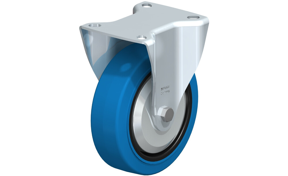 - Reifen: hochwertiger Elastik-Vollgummi "Blickle EasyRoll" in Leichtlaufqualität, Härte 65 Shore A, Farbe blau, spurlos