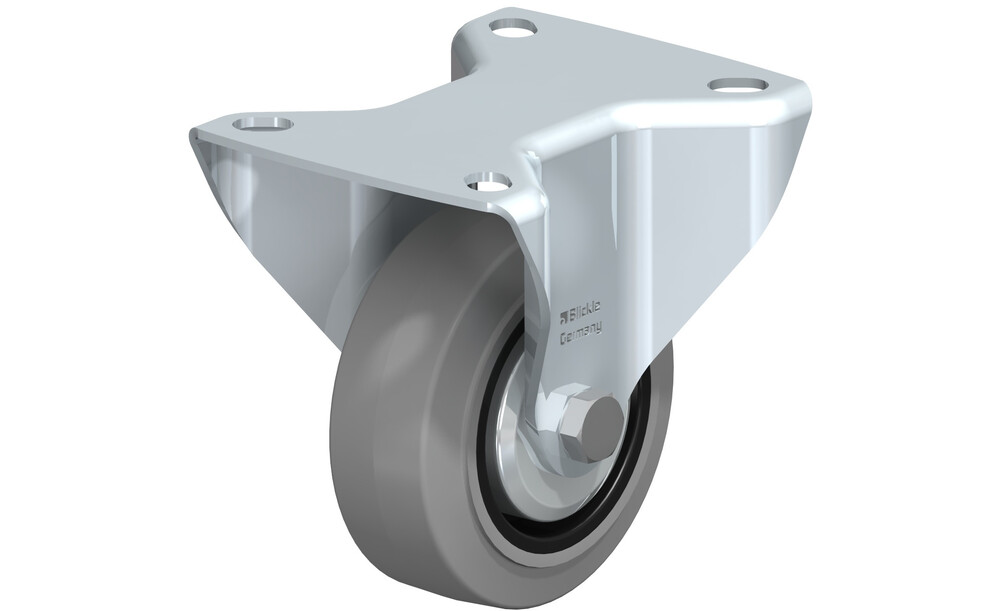 - Reifen: hochwertiger Elastik-Vollgummi "Blickle EasyRoll" in Leichtlaufqualität, Härte 65 Shore A, Farbe grau, spurlos