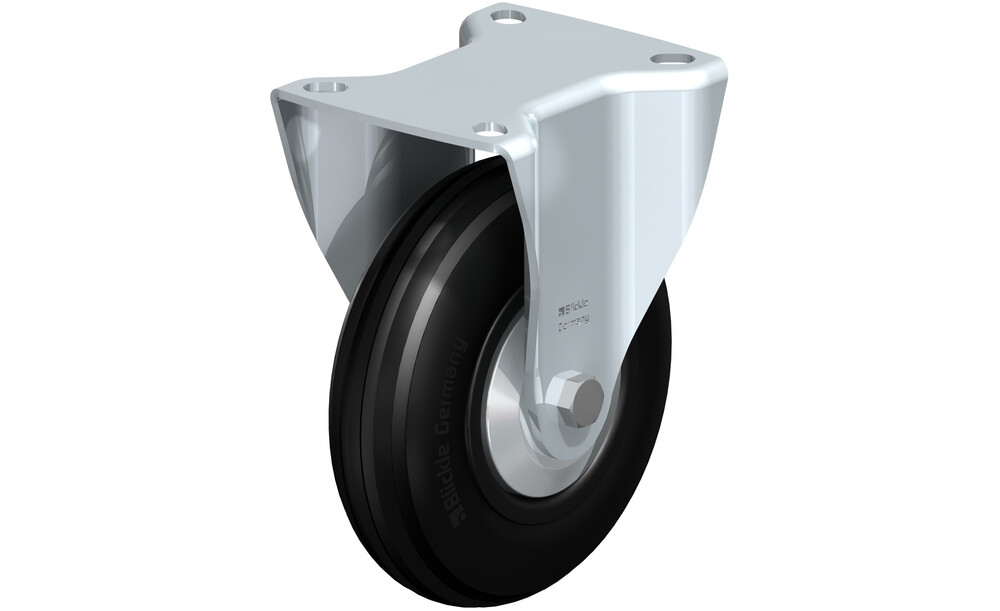 Stahlblech-Bockrolle, mittelschwere Ausführung, mit Anschraubplatte, Rad mit Weichgummireifen 'Blickle Soft', mit Kunststoff-Felge, mit Fadenschutz aus Stahl