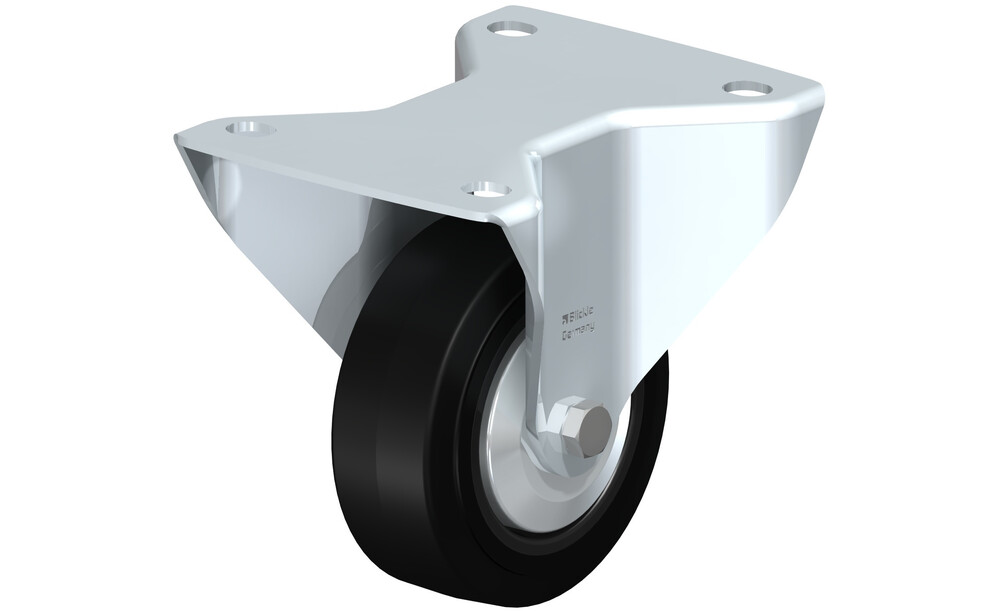 • Reifen: hochwertiger Elastik-Vollgummi "Blickle EasyRoll" in Leichtlaufqualität, Härte 65 Shore A, Farbe schwarz