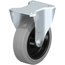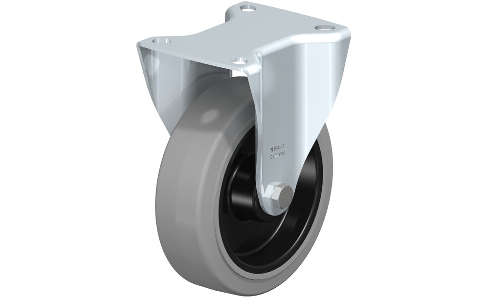 - Reifen: hochwertiger Elastik-Vollgummi "Blickle EasyRoll" in Leichtlaufqualität, Härte 65 Shore A, Farbe grau, spurlos