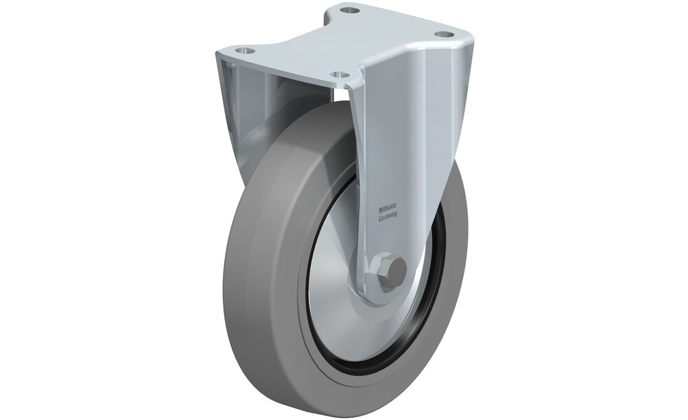 - Reifen: hochwertiger Elastik-Vollgummi "Blickle EasyRoll" in Leichtlaufqualität, Härte 65 Shore A, Farbe grau, spurlos