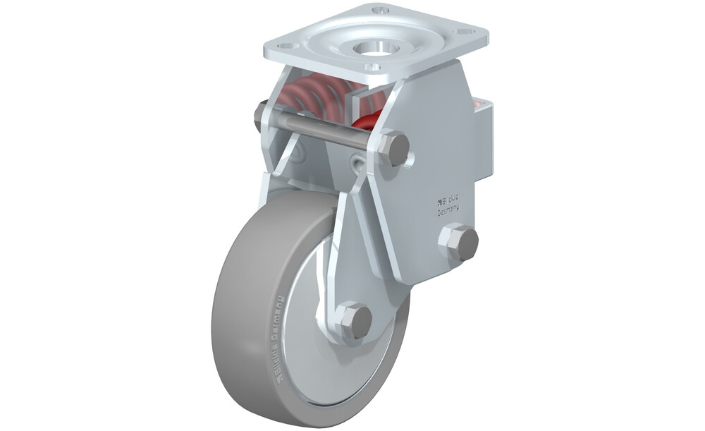 - Laufbelag: hochwertiges Polyurethan-Elastomer Blickle Extrathane®, Härte 92 Shore A, Farbe grau, spurlos, kontaktverfärbungsfrei