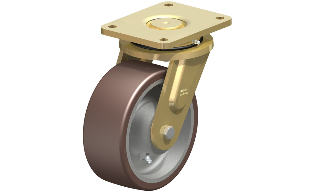 - Laufbelag: hochwertiges Polyurethan-Elastomer Blickle Besthane®, Härte 92 Shore A, Farbe braun, spurlos, kontaktverfärbungsfrei