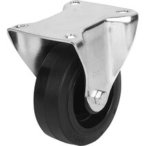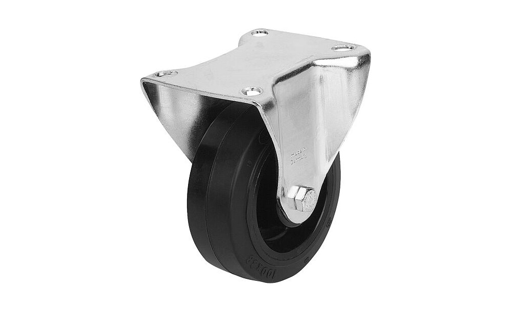 Werkstoff: Gehäuse Stahlblech, Radkörper aus PA 6 mit aufvulkanisiertem Marken-Elastik-Vollgummireifen. Ausführung: Gehäuse gepresst. Räder mit Rollenlager. Hinweis: Radachse verschraubt. Räder stoß- und schlagfest.