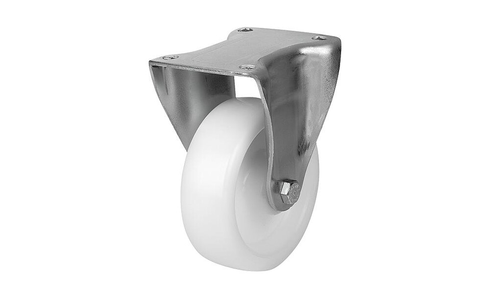 Durch die gehärteten Lagerschalen sind die Rollen besonders stoß- und schlagfest. Die Räder besitzen eine hohe Abriebfestigkeit. Radachse verschraubt.
