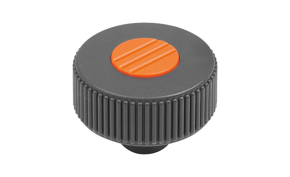 RÄNDELRAD GR.3, D1=63 D=M10, , FORM:K, THERMOPLAST SCHWARZGRAU RAL7021, KOMP:EDELSTAHL, DECKEL:ORANGE RAL2004