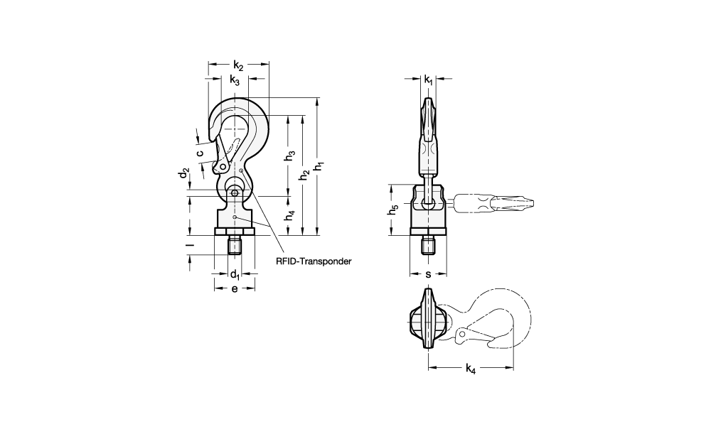 Die Lasthaken GN 5862 sind drehbar kugelgelagert. Durch den beweglichen Haken nehmen sie Lasten in jeder zugelassenen Zugrichtung auf.