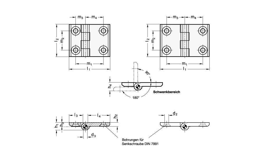 Scharniere GN 237 mit horizontal verlängerten Scharnierflügeln zeichnen sich durch ihre kompakte und stabile Bauweise aus. Sie werden eingesetzt, wenn vergrößerte Abstände der Befestigungsbohrungen erforderlich sind.