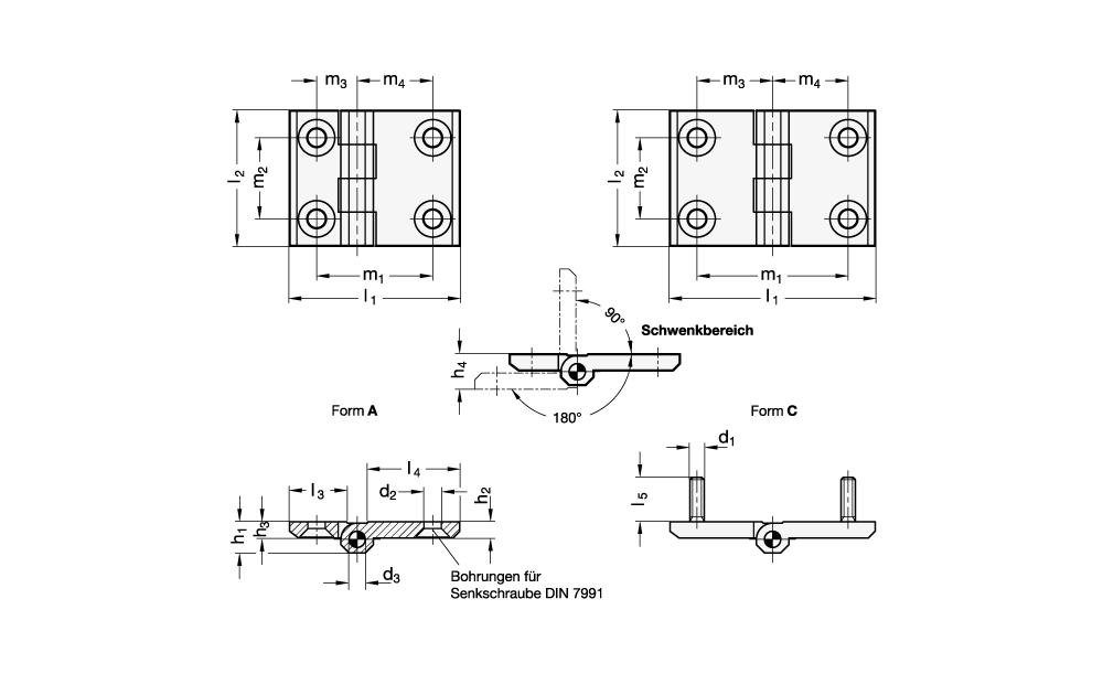 Scharniere GN 237 mit horizontal verlängerten Scharnierflügeln zeichnen sich durch ihre kompakte und stabile Bauweise aus. Sie werden eingesetzt, wenn vergrößerte Abstände der Befestigungsbohrungen erforderlich sind.