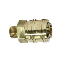 Schnellverschlusskupplung NW 7,2 »connect line«, MS blank, G 1/4 AG, Betriebsdr. 0 - 35 bar, Mediums-/Umgeb.temp. -20°C bis 100°C. Die universelle Einhand-Schnellverschlusskupplung in einseitig absperrender Ausführung zu einem enorm günstigen Preis. Durch die geschlossene Verriegelungshülse wird ein Verschmutzen der Innenteile verhindert. Bei Verwendung von Stahlnippeln kann diese Kupplung aufgrund ihrer gehärteten Verriegelungsstifte auch an Druckluftwerkzeugen verwendet werden. Kupplungen und Nippel mit dichtender Gewindebeschichtung: Montagefertige Polyacrylat-Gewindebeschichtung für sofortige und hohe Dichtheit ohne Aushärtungsprozess. Das dauerelastische Dichtmaterial kann bis zu 45° nachjustiert werden, ohne die Dichtheit zu beeinflussen. Gesundheitlich unbedenklich. Leichte Montage und Demontage. Um Verletzungen oder den "Peitschenhiebeffekt" zu vermeiden, empfehlen wir den Stecknippel beim Entkuppeln mit einer Hand festzuhalten. Diese Schnellverschlusskupplung eignet sich nicht für die direkte Montage an pulsierendem Werkzeug. Wir empfehlen die Verwendung unserer Vibrationsdämpfer, gemäß ISO 6150, § 7.1. Einsatzgebiete: Pneumatik, Maschinen- und Anlagenbau, Mess-, Regel- und Steuerungstechnik, Fertigungsindustrie, Medizintechnik, Chemie-/ Pharmaindustrie, Werkstätten, Automotive.