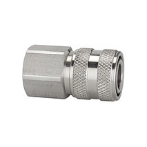 Schnellverschlusskupplung NW 7,2, Edelstahl 1.4305, G 1/2 IG, Betriebsdruck max. 35 bar, Mediums-/Umgebungstemp. -20 °C bis 200 °C. Die klassische Standardkupplung in einseitig absperrender Ausführung aus Edelstahl. Die geschlossene Verriegelungshülse verhindert das Verschmutzen der Innenteile. Wir empfehlen die Verwendung von Edelstahlnippeln und -tüllen! Um Verletzungen oder den "Peitschenhiebeffekt" zu vermeiden, empfehlen wir den Stecknippel beim Entkuppeln mit einer Hand festzuhalten. Diese Schnellverschlusskupplung eignet sich nicht für die direkte Montage an pulsierendem Werkzeug. Wir empfehlen die Verwendung unserer Vibrationsdämpfer, gemäß ISO 6150, § 7.1. Einsatzgebiete: Pneumatik, Maschinen- und Anlagenbau, Mess-, Regel- und Steuerungstechnik, Fertigungsindustrie, Chemie-/ Pharmaindustrie, Werkstätten, Automotive, Offshore.