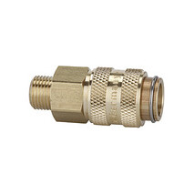Schnellverschlusskupplung NW 5, Messing blank, G 1/8 AG, Betriebsdruck 0 - 35 bar, Mediums-/Umgebungstemp. -20 °C bis 100 °C. Einseitig absperrende Einhand-Schnellverschlusskupplung mit kleinen Baumaßen und großem Durchgang bei geringem Druckabfall. Um Verletzungen oder den "Peitschenhiebeffekt" zu vermeiden, empfehlen wir den Stecknippel beim Entkuppeln mit einer Hand festzuhalten. Einsatzgebiete: Pneumatik, Mess-, Regel- und Steuerungstechnik, Fertigungsindustrie, Medizintechnik, Chemie-/ Pharmaindustrie, Automotive, Nahrungsmitteltechnik.