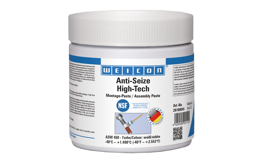 Die Montagepaste WEICON Anti Seize High-Tech ist hochtemperaturbeständig, hat eine außergewöhnlich gute Trennwirkung, ist metallfrei, werkstoffneutral und hat eine NSF-Zulassung.