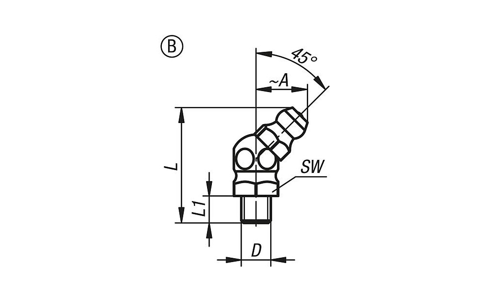 KEGELSCHMIERNIPPEL DIN71412, FORM:B ABGEWINKELT 45° M. 6-KANT, M06X1, L=23, STAHL GEHÄRTET UND VERZINKT