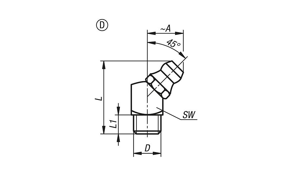KEGELSCHMIERNIPPEL DIN71412, FORM:D ABGEWINKELT 45° M. 4-KANT, M10X1, L=20,5, STAHL GEHÄRTET UND VERZINKT