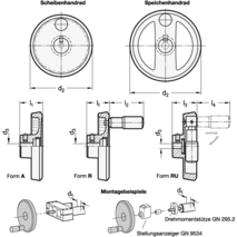 Handräder GN 9234 sind für den Einsatz an Lineareinheiten vorgesehen und je nach Größe als Scheiben- bzw. Speichenhandräder ausgeführt.