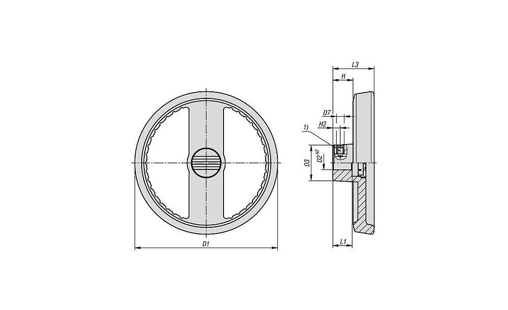 Die Handräder können durch Querverstiftung oder durch eine Zylinderschraube DIN 6912 und eine Vorlegscheibe K0173 axial durch Passfederverbindung auf der Welle befestigt werden.