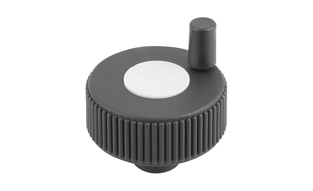 RÄNDELRAD MIT GRIFF GR.3, D1=63, FORM:M MIT QUERBOHRUNG, THERMOPLAST SCHWARZGRAU RAL7021, KOMP:STAHL