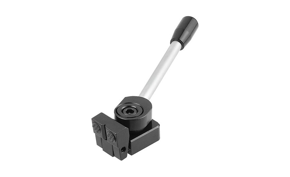 Der Niederzugspanner kann durch die Zentrierbuchse (siehe Zeichnung) auf einem modularen Rastersystem positioniert und gespannt werden.