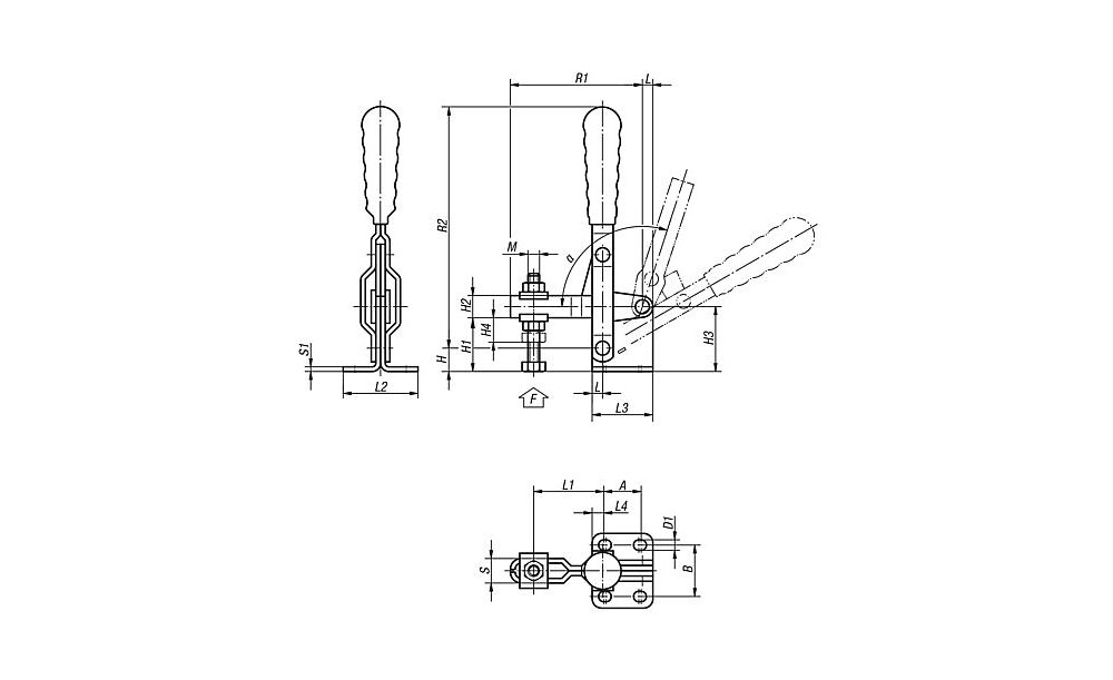 SCHNELLSPANNER VERTIKAL, FUß WAAGRECHT, STAHL VERZINKT, MIT ANDRUCKSPINDEL M=...