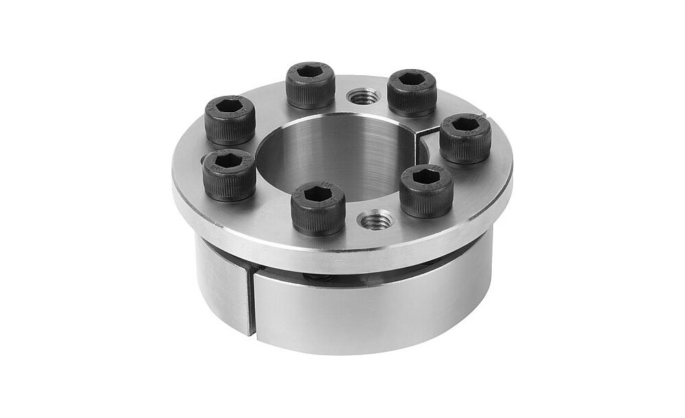 Demontage: Alle Schrauben entfernen und in die Abdrückgewinde des vorderen Flansches eindrehen. Schrauben über Kreuz in mehreren Stufen anziehen bis sich der Spannsatz löst.