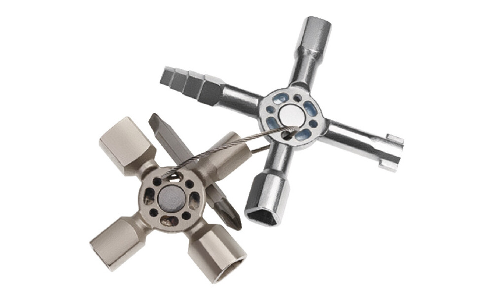 Multifunktionaler Schlüssel für die Betätigung von Schließungen aus den Bereichen Gebäudetechnik (Heizung und Sanitär, Klima- und Belüftungstechnik, Elektrotechnik), Gas- und Wasserversorgung und Absperrsysteme.