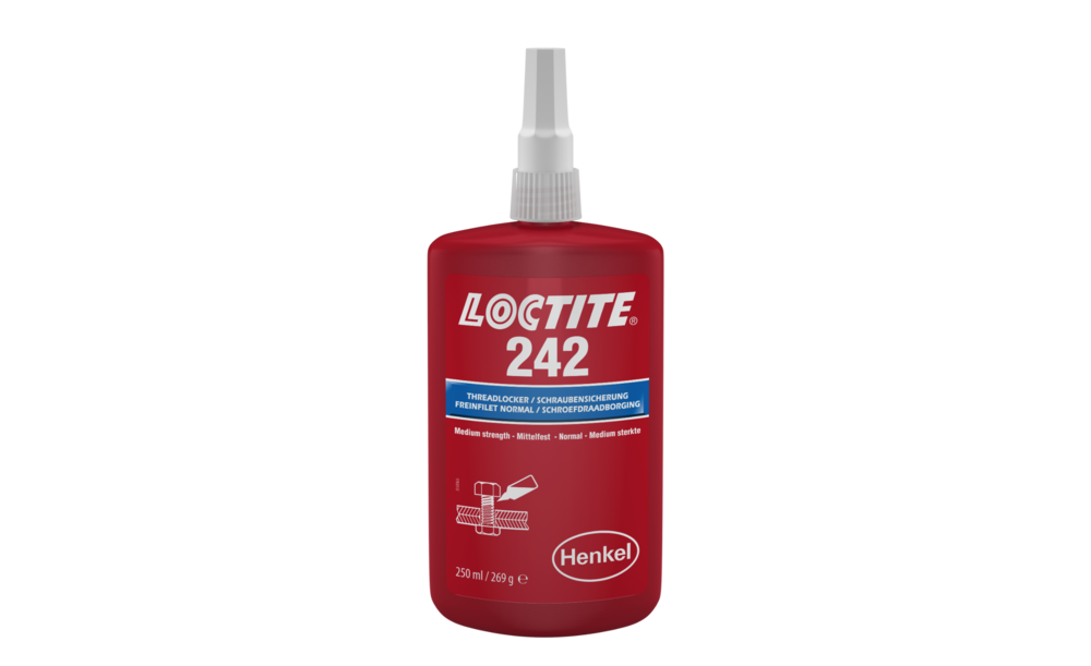LOCTITE 242 ist eine mittelfeste, mittelviskose Schraubensicherung auf Methacrylatbasis für den universellen Einsatz. Das Produkt erreicht Handfestigkeit in nur 5 Minuten auf Stahl, 15 Minuten auf Messing und 20 Minuten auf Edelstahl. LOCTITE 242 ist thixotrop, um das Abwandern nach der Auftragung zu verhindern und wird für Gewindeverbindungen eingesetzt, die mit normalem Handwerkzeug demontierbar sein müssen.