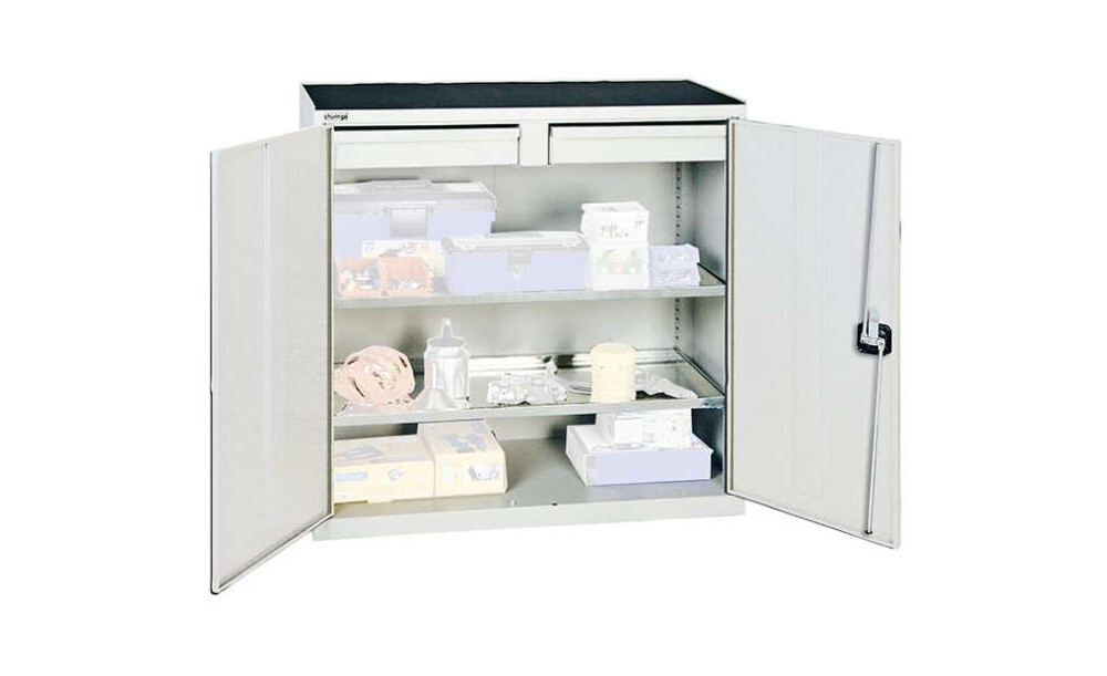 -Werkzeug- und Materialschrank Serie 2000, 2 Schubladen, 2 Fachböden Diese Werkzeugschränke eignen sich vor allem für Produktionsbereiche. Sie sind aus Qualitätsfeinblech gefertigt und verschweißt. Die Oberfläche ist pulverbeschichtet, unempfindlich, langlebig, schlag- und kratzfest.