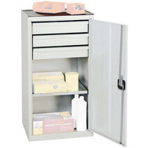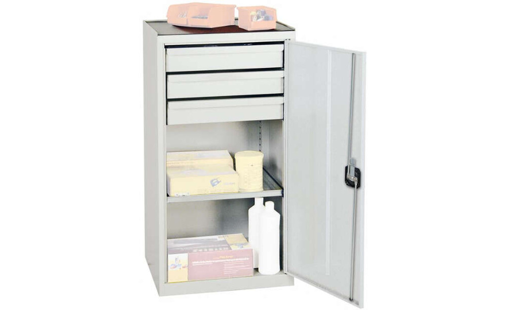 -Werkzeug- und Materialschrank Serie 2000, 3 Schubladen, 1 Fachboden Diese Werkzeugschränke eignen sich vor allem für Produktionsbereiche. Sie sind aus Qualitätsfeinblech gefertigt und verschweißt. Die Oberfläche ist pulverbeschichtet, unempfindlich, langlebig, schlag- und kratzfest.
