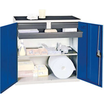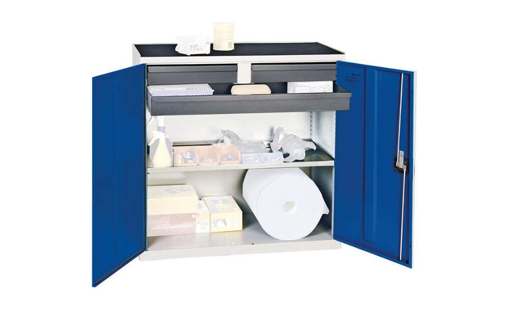 -Werkzeug- und Materialschrank Serie 3000, 2 Schubladen, 1 Großraumschublade, 1 Wannenboden Die Werkzeug- und Materialschränke dieser Serie sind für alle betrieblichen Bereiche geeignet. Sie sind aus Qualitätsfeinblech gefertigt und verschweißt. Die Oberfläche ist pulverbeschichtet, unempfindlich, langlebig, schlag- und kratzfest.