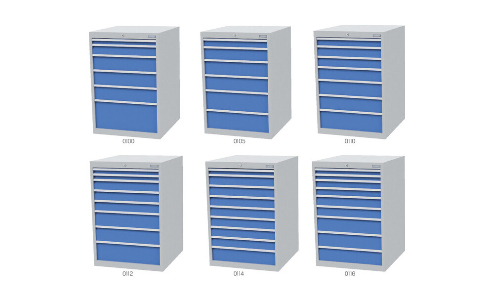 - Ausführung: mit 7 Schubladen, 1× 75 mm, 2× 100 mm, 1× 125 mm, 2× 150 mm, 1× 200 mm
