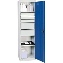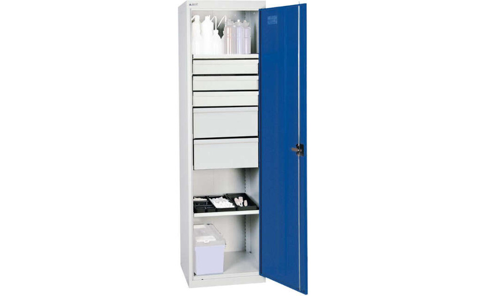 -Werkzeug- und Materialschrank Serie 2000, 5 Schubladen, 2 Fachböden Diese Werkzeugschränke eignen sich vor allem für Produktionsbereiche. Sie sind aus Qualitätsfeinblech gefertigt und verschweißt. Die Oberfläche ist pulverbeschichtet, unempfindlich, langlebig, schlag- und kratzfest.