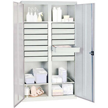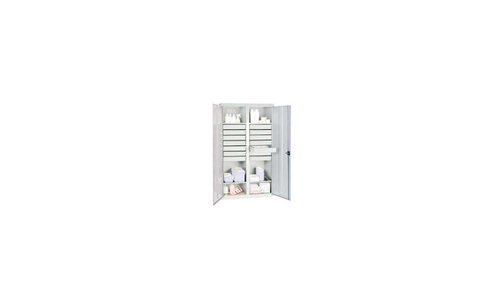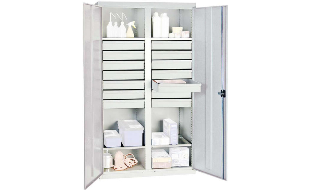 -Werkzeug- und Materialschrank Serie 2000, 14 Schubladen, 4 Fachböden, Mitteltrennwand Diese Werkzeugschränke eignen sich vor allem für Produktionsbereiche. Sie sind aus Qualitätsfeinblech gefertigt und verschweißt. Die Oberfläche ist pulverbeschichtet, unempfindlich, langlebig, schlag- und kratzfest.