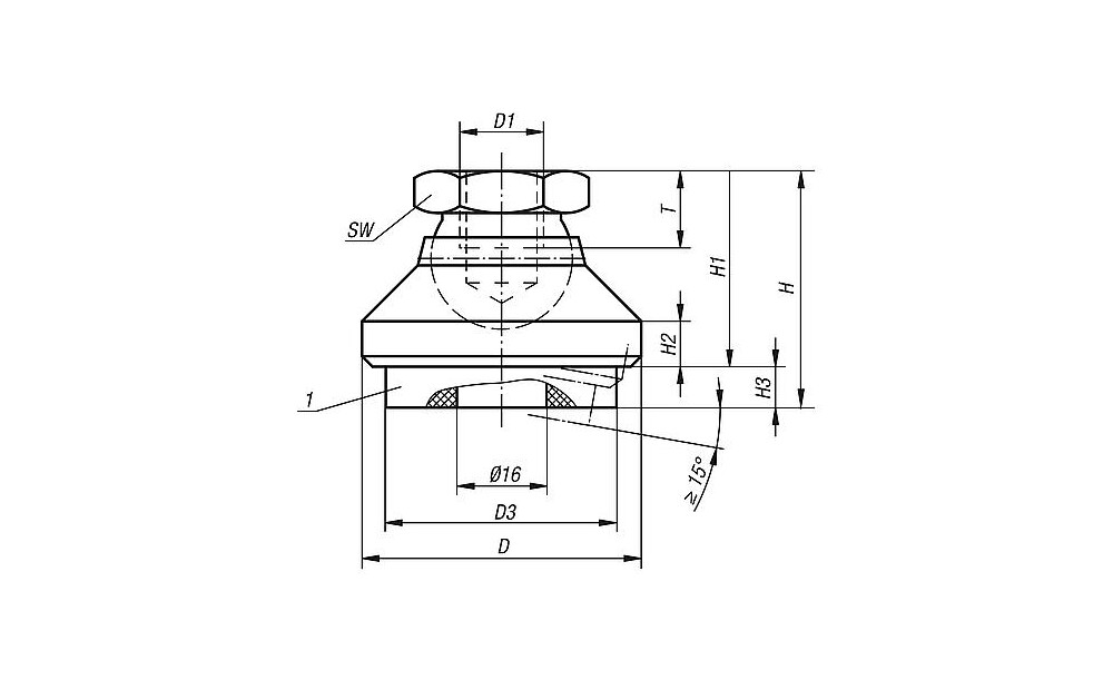 GELENKTELLER SCHWINGUNGSDÄMPFEND D1=3/8-16, D=32, H=30, STAHL