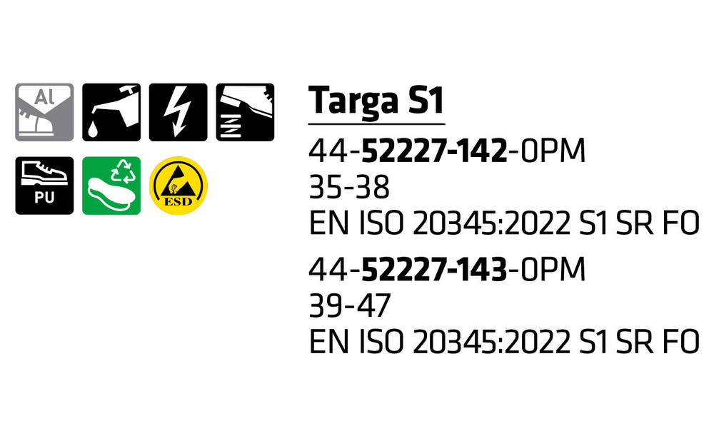 - Eigenschaften Sohle: stoßdämpfend, leicht, rutschfest, antistatisch, zusätzliche ESD-Absicherung, weitgehende Öl- und Chemikalienbeständigkeit, hitzebeständig bis 120°C