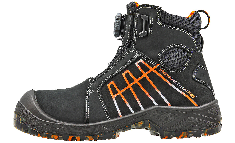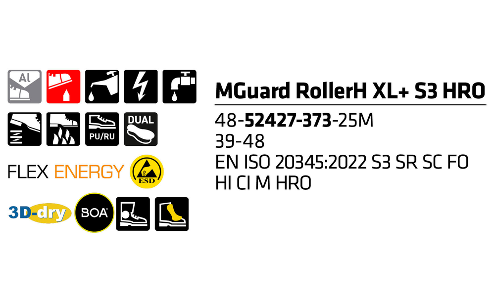Der MGuard Roller wurde für anspruchsvolles Arbeitsumfeld entwickelt. Der integrierte Metatarsal Ristschutz dämpft auf den Spannbereich einwirkende Stöße um bis zu 90% ab. Die FlexEnergy®-Stoßdämpfung fängt mehr als 55% der kinetischen Energie auf und gibt sie an den Bewegungsapparat zurück. Die Sievi TractionPro®-Antirutschsohle garantiert maximalen Halt. Für zusätzlichen Komfort sorgen Dual Comfort-Einlegesohlen, BOA® Fit System-Verschluss und XL-Leisten.