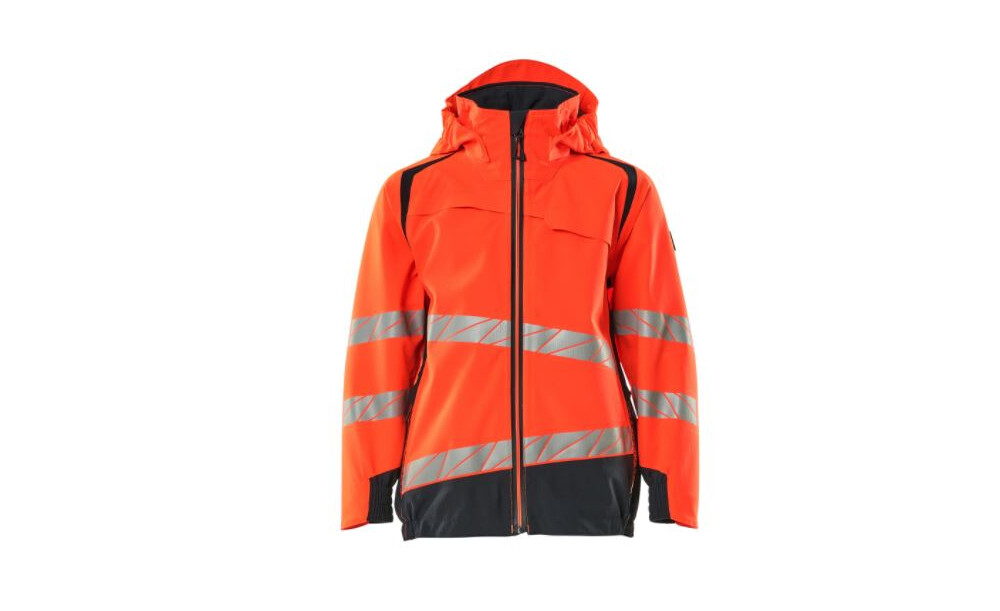 Zweifarbig. Fluoreszierend und mit schräg verlaufenden Reflexen. Ausgezeichnete atmungsaktive Eigenschaften sowie wind- und wasserdicht. Nähte sind verklebt. Abnehmbare, gefütterte Kapuze mit Elastikeinsatz. Verschluss mit Reißverschluss und inwendiger Wetterschutzleiste. Vordertaschen mit Reißverschluss. Gummizug an den Handgelenken. Gummizug in der Unterkante an den Seiten.