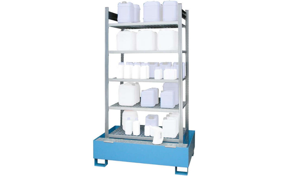 -Kleingebinde-Gefahrstoffregale mit lackierter Standwanne Diese Kleingebinde-Gefahrstoffregale sind beidseitig nutzbar und eignen sich zur vorschriftsmäßigen Lagerung von wassergefährdenden und entzündbaren Stoffen.
