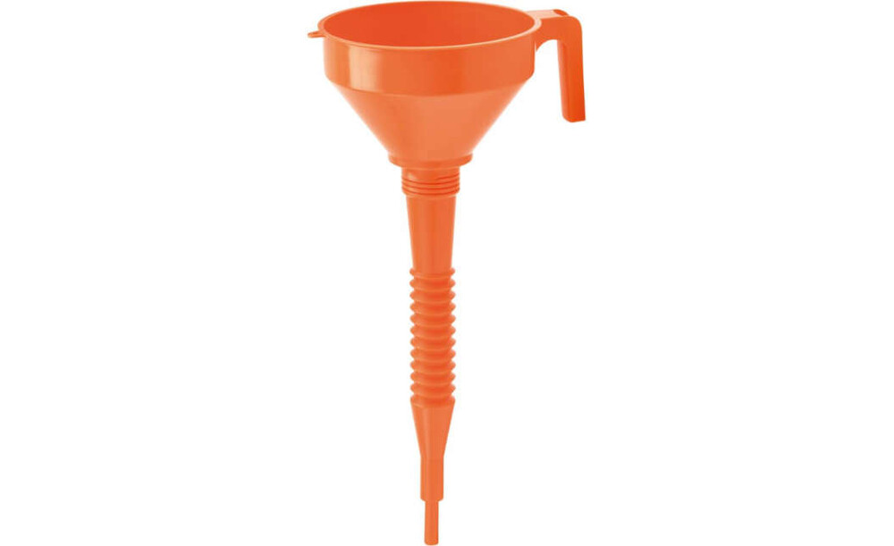 -Kunststofftrichter, mit flexiblem Auslauf Dieser Polyethylen-(HDPE)-Kunststofftrichter ist öl-, kraftstoff- und säurebeständig.